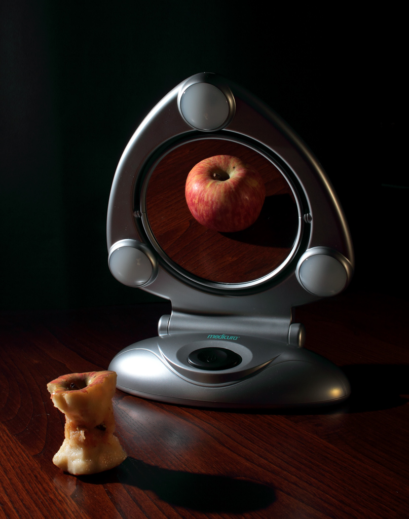 La mela dentro lo specchio è "frutto" di uno scatto precedente, prima che fosse mangiata, quindi semplicemente clonata dal precedente scatto.