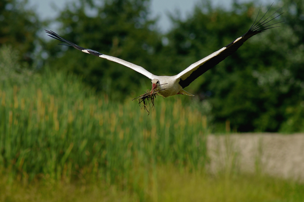 Cicogna mentre sta portando i rami per la costruzione del nido