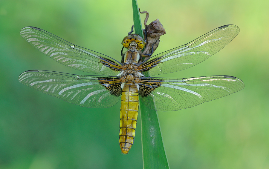 Mi devo inchinare davanti alle tue meraviglie! Questa poi, per me è suggestiva al massimo... dettaglio da paura, sfondo "drammatico" e incantevole la veduta in pianta del bellissimo esemplare neo sfarfallato, con la sua exuvia, che fa capolino da dietro...