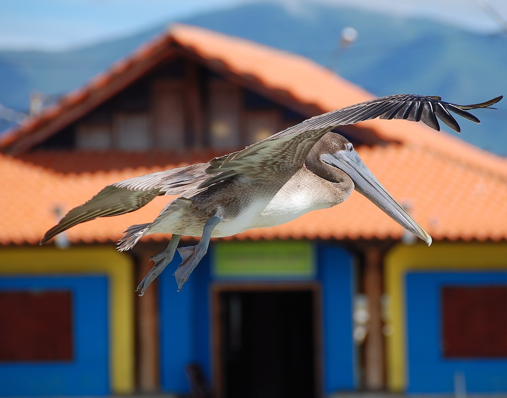La cattura in volo direi che è ottima, interessante anche lo sfondo variopinto della casetta presumo sul mare visti i colori accesi