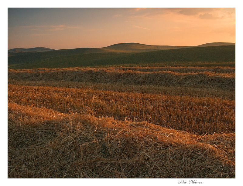 | la calda luce della sera che illumina questi bei campi collinari. Mi piace molto per le sinuose linee e per il senso di tranquillita' che trasmette |