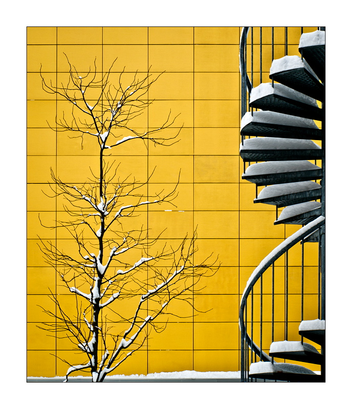 Il piacevole grafismo dell'alberello spoglio si contrappone benissimo alle geometrie disegnate dalle vetrate e dalla scala a chiocciola. La bella tavolozza monocromatica completa quest'opera che a mio modesto avviso meriterebbe almeno una menzione come foto della settimana.