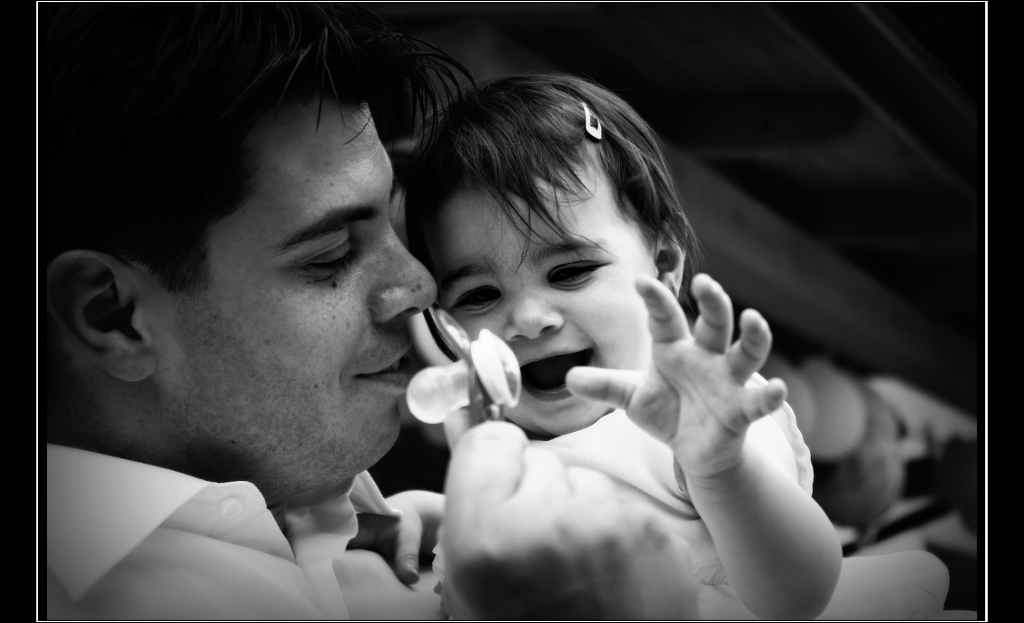 Coinvolge e strappa un sorriso di tenerezza il gesto di lui che sottrae il ciuccio e quello divertito e partecipe della piccola che quasi tenta di "ghermire" l'oggetto dei suoi desideri.