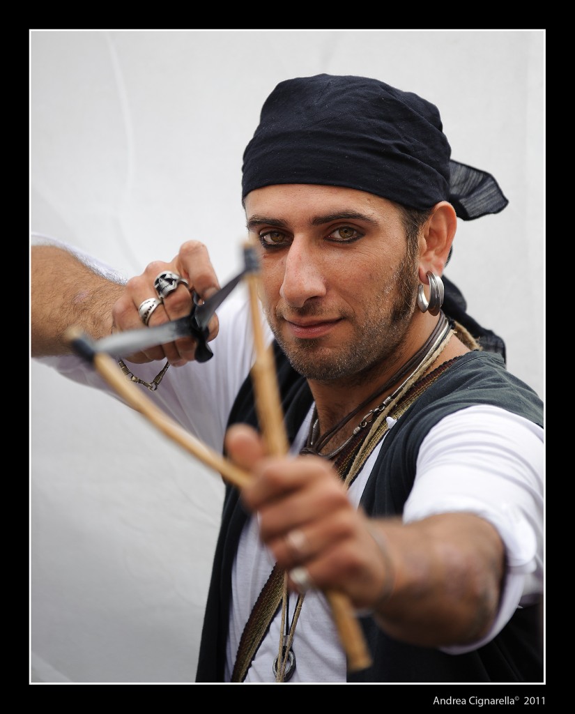 Il pirata dovrebbe essere un po' più abbronzato (fondotinta), unto lucido (qualche prodotto grasso oleoso) e con la maglietta sporca, non candida: un bell'alone sotto il braccio sollevato... con Photoshop!