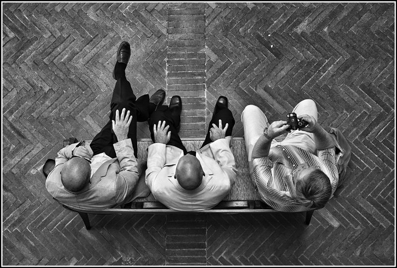 Bel b/n di una ripresa insolita per un trio di signori, che viene impreziosita dal gesto dell'uomo di destra che fotografando fa sorgere la curiosità dello spettatore nel voler conoscere il "soggetto del soggetto".