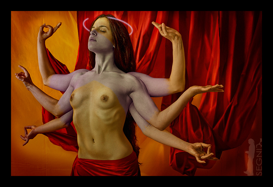 Mi spieghi solo la differenza di colore su corpo e braccia? Si richiama a qualche iconografia tradizionale?