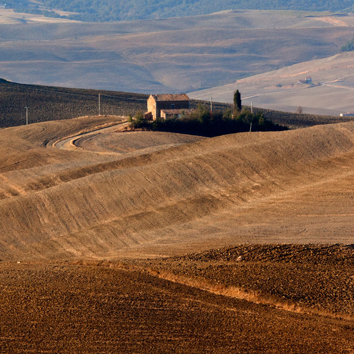 Quando viaggio in macchina,attraversando le campagne toscane,gli occhi si soffermano su questi paesaggi,sono attratta dal colore bronzo rosato come in questa bella foto, semplice ma suggestiva,calda nei colori. Sullo sfondo un leggero distacco bluastro mette in risalto la terra dorata che da un senso di serenità all'anima. Un mio parere anche se sono poco esperta, avrei soltanto sfumato un po' la terra,c'è un po' troppo contrasto; tutto qui