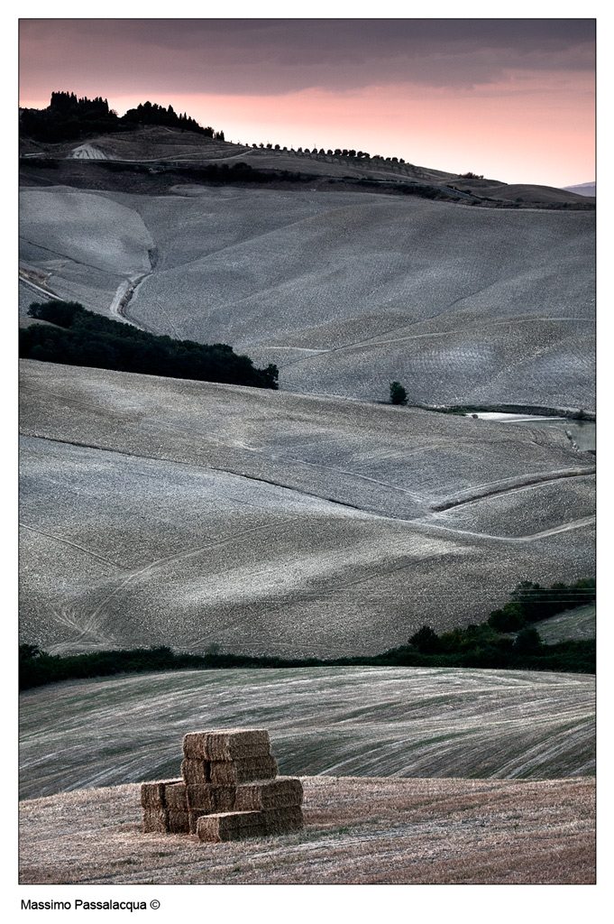 ma che bello questo taglio verticale in cui il paesaggio è fortemente ancorato alle pile di paglia in pp per poi degradare con linee e curve e poi risalire con piani armonici verso, la cima del colle. la composizione è veramente pregevole da gran paesaggista!
