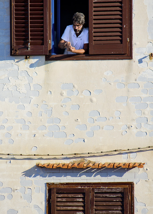 non riesco a collegare il titolo con quello che sta facendo il soggetto (sembra si stia facendo manicure), trovo invece interessante il muro con la pittura parzialmente staccata, un taglio quadrato dal basso lo trovo interessante Smile