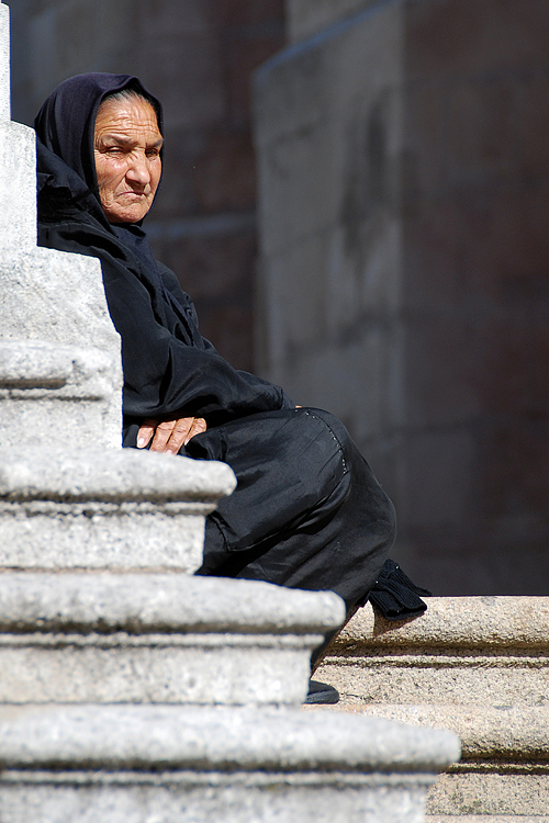 Sembra cioè in qualche modo "appartenere" al bianco della pietra il nero cupo di quella veste bruciata dal sole, ...persino lo stare dell'anziana signora sembra completare e viceversa il disegno delle forme architettoniche in una sorta di simbiosi che è quella di decine ...centinaia di spazi dello scenario urbano in cui si ritagliano interi brani di vita.