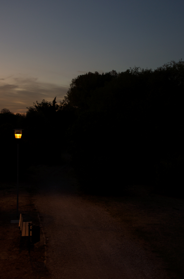 effettivamente c' è poco da vedere e molto da immaginare, è una panchina di un parco fluviale poco distante da dove abito ripresa da un ponte pedonale, forse non ci sosterei già a quell' ora ma non mi dispiacerebbe farlo, mi sembra un bel luogo per perdersi in pensieri