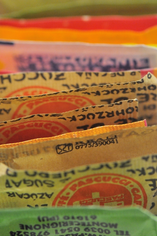 Mi piacciono le ricerche di dettagli in macro, in successioni di forme e colori di oggetti d'uso quotidiano, diverse volte mi sono cimentato anche io, è un genere che apprezzo molto, tuttavia ti suggerirei eventualmente per il prossimo scatto, di ruotare la prima e la terza bustina, a partire dal basso, così da evitare indirizzo di produzione (o del bar) e lotto Smile