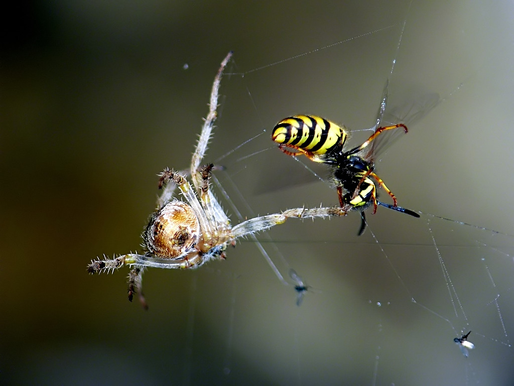 P.S....ero lì che cercavo di mettere a fuoco il fetecchio, quando me lo vedo sparire dall'inquadratura....mi sposto e vedo la lotta con la vespa, che appena il ragno allunga la zampa per catturarla, lei la azzanna, gliela tronca e vola via...il tutto in una frazione di secondo...lo scatto tecnicamente è quello che è....ma emozionalmente a me piace...
