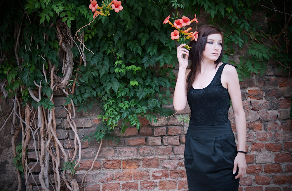 Mi piace questa composizione, la modella è decentrata ma ci può stare in quanto il resto della scena è interessante e non monotona (muro, piante, radici).
