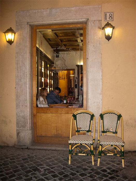 2 piccoli lampioni al muro, 2 sedie, 2 persone: la ripetizione del pattern numerico da ritmo alla foto. Lo sguardo dell'uomo all'interno del locale chiama nel quadro l'altro elemento soggettivo: il fotografo.