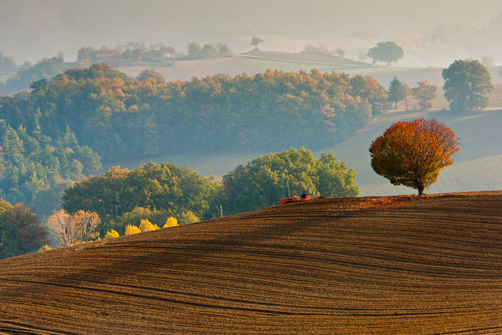 Molto bella anche per me. Il trattore ci sta tutto, il fatto che sia un po' mosso è un piccolo inconveniente ma inevitabile, e poi si raccorda col titolo. Il colore è gestito benissimo; l'albero verdemarrone a destra e le punte gialle degli alberetti che sbucano da dietro al pendio sono splendidi.