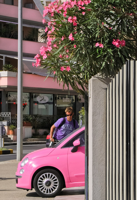 Pink, grey, righe orizzontali/verticali.. il ragazzo con la maglia viola non ha bisogno di far altro che esserci per dare una variazione tonale sul tema.