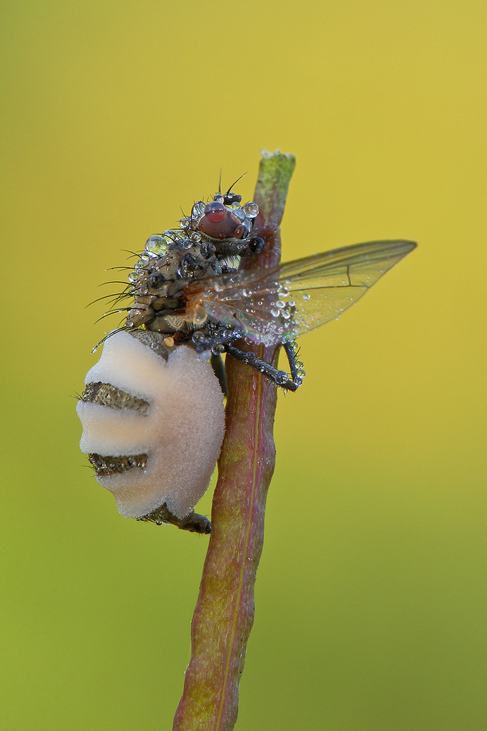 ho trovato questa mosca infettata dal fungo Entomophthora muscae.devo dire che era molto impressionante ma anche molto interessante osservare il suo corpicino avvolto in quel mortale mantello bianco.non so' se era gia' morta oppure solo paralizzata,perche' anche se avesse raggiunto la parte piu' alta dello stelo non avrebbe assunto la posizione tipica con il capo in giu' e l'addome in fuori .