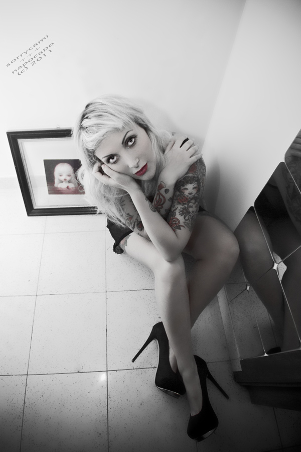 trattamento cromatico che fa svanire quasi tutto il colore a favore del solo rosso che spicca sulle labbra e i tatuaggi. Il grandangolo spinto inquadra dall'alto enfatizzando lo sguardo e la posa raccolta della modella che assume quasi le sembianze della bambina ritratta sul quadro al suo fianco e che sembra emergere da un lago di sangue. Estrema com'è tua abitudine.