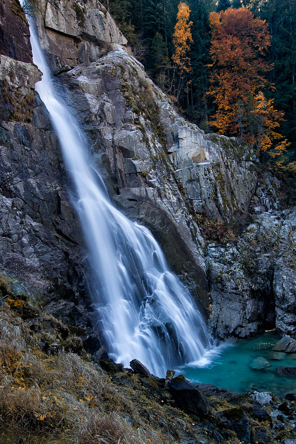 Mi piace il gioco di contrapposizione tra toni caldi (due alberi rossicci) e freddi (grigioazzurri di primo piano ed acqua); bella e dinamica la linea della cascata e l'inquadratura verticale.