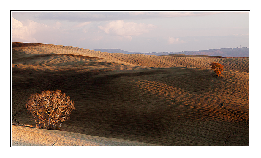 poco da dire..bellissime trame che che la radente luce disegna sapientemente...una chicca gli alberi in perfetta contrapposizione ....sembrano salutarsi...un bel lavoro fiò....ciao...  |
