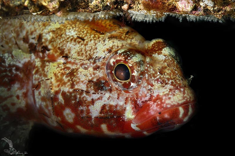 Un grosso gobide (Gobius cruentatus)accudisce alla sua nidiata deposta sulla volta della tana.