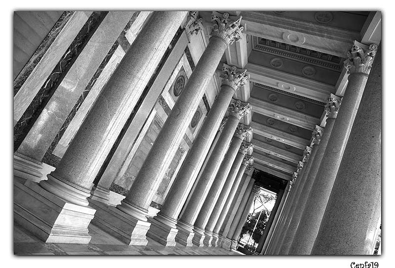 La foto mi piace molto , soprattutto è un ottimo spunto per chi, come me, non ha grande inventiva nell'approccio agli edifici. Solo una domanda: mi pare di aver capito che hai cercato di seguire la retta disegnata dalle basi delle colonne di sinistra nella scelta dell'inquadratura. Ma se è così, è una scelta quella di far divergere leggermente le due linee (basi delle colonne - base della foto)? Da cosa è dettata?