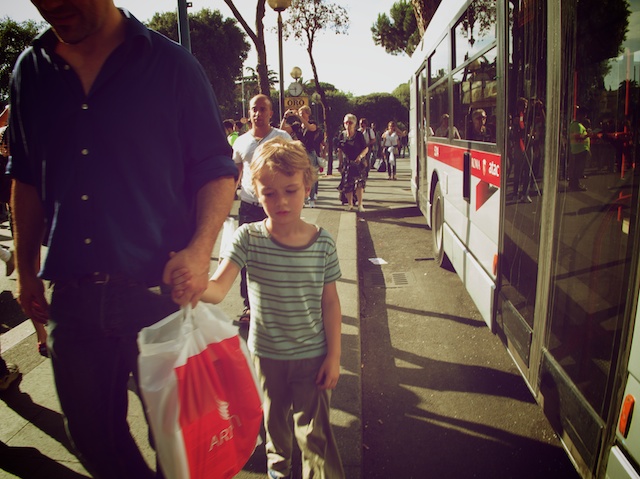 Non è pulitissima come sfondo (vedi ragazzo calvo), ma lo sguardo chino del bambino trascinato dall'adulto mozzato mi pare sia una piccola storia.