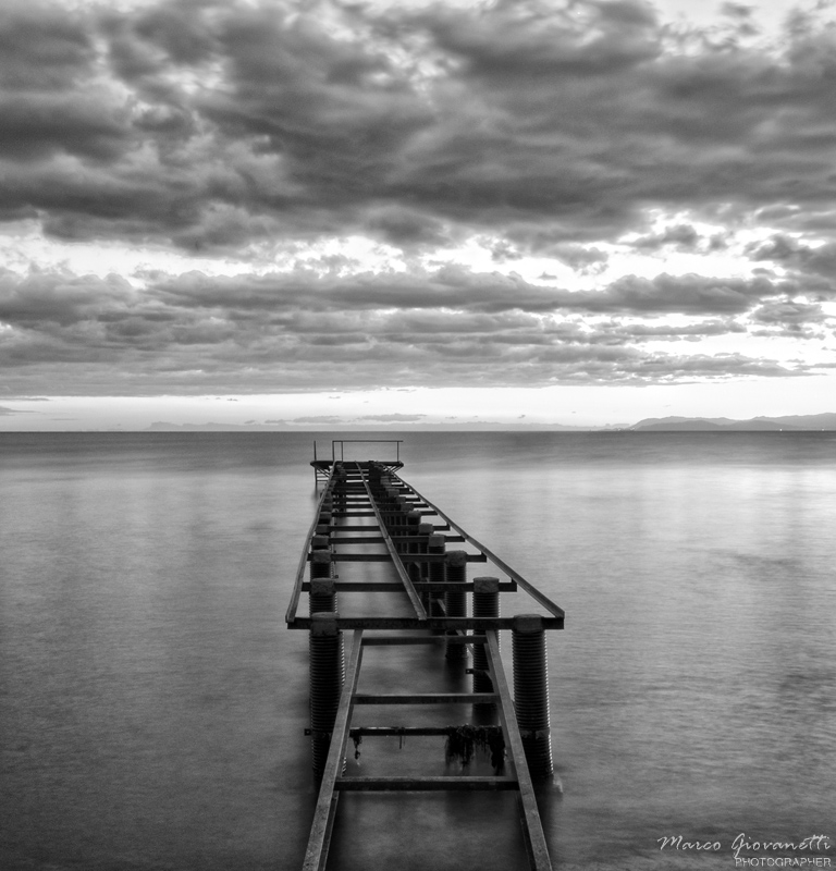 In questo scatto trovo che le sfumature acciaio dell'acqua ben si armonizzino con le strutture del pontile, la posizione dominante del pontile anch'essa armonizza con il mare e la scoposizione dettata dall'orizzonte, completa questa bella foto che mi permette di complimentarmi con l'autore.