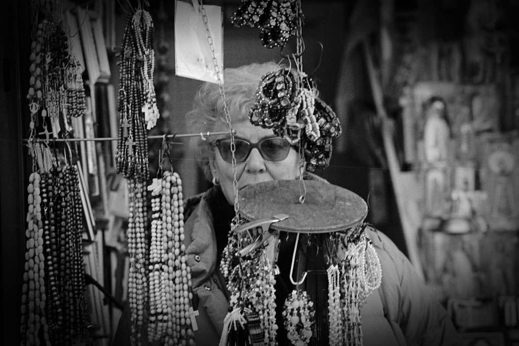 Allora (mi) manca qualcosa in più sul contesto: qui i rosari potrebbero confondersi con collanine, e le figure a dx son molto sfocate..se ti ricapita, proverei a fare un mini-reportage, o a cercare inquadrature più ampie.