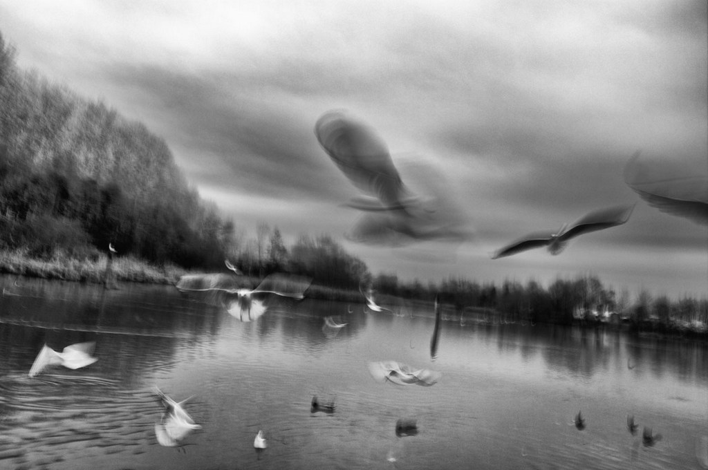 la foto qui trovo che sia poetica, distaccata dalla realtà, un ottimo b/n e un notevole sfocato. |