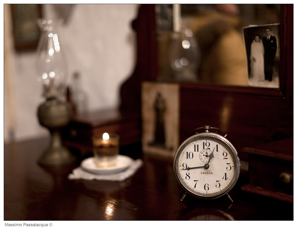 La poesia del passato, perfettamente resa da uno sfocato che richiama il progressivo dissolversi delle immagini conservate nella memoria. Niidissima, la bella sveglia Veglia che ha inevitabilmente fatto parte della vita di chi è nato come me nella prima metà del secolo scorso. Il tempo che passa? Naturalmente, credo non fosse tua intenzione condurre proprio a questa lettura. Sono solo elucubrazioni mie. Ma non c'è dubbio che la tua foto ha un notevole fascino per me.