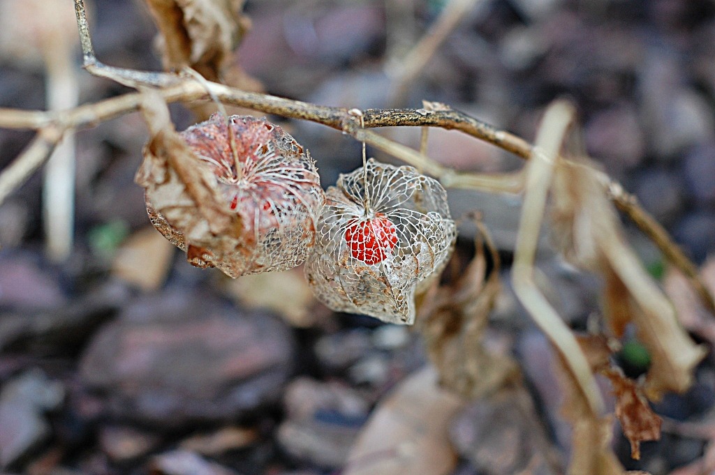 L'alchechengi. Il loro rosso frutto ingabbiato nella trama delle piccole "lanterne" consumate dalle intemperie ...dovevi levare la foglia che nasconde il secondo frutto a sinistra.