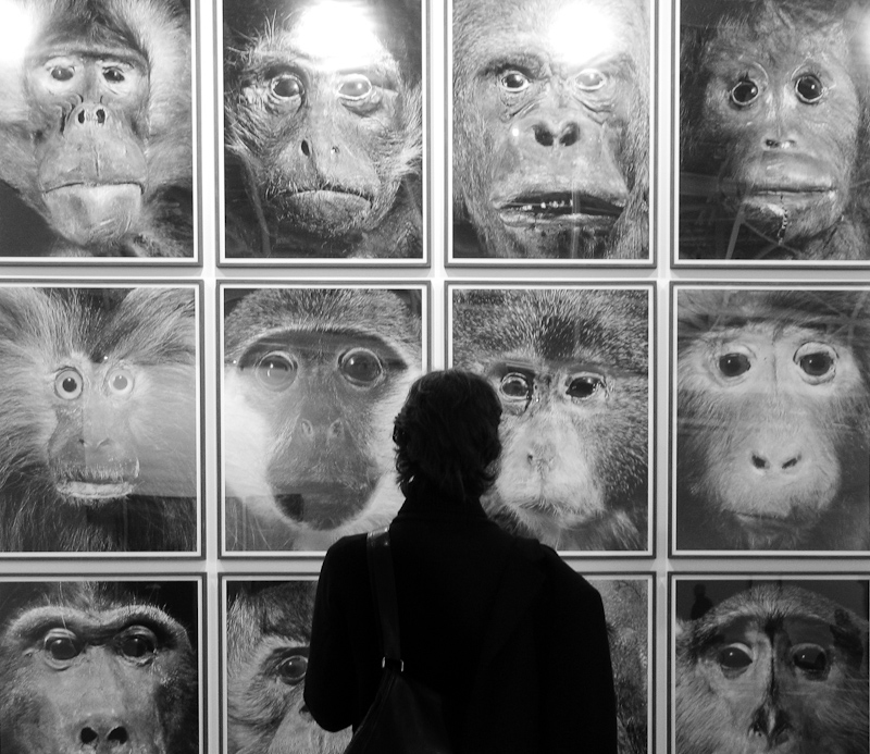 Quoto Mario Zacchi, lo sguardo delle scimmie è quanto l'artista offre al pubblico e tale viene riportato in questa foto. L'inserimento di uno spettatore ci "materializza" per traslato nello scatto ma non sposta il senso originario: amp meglio in Varie.