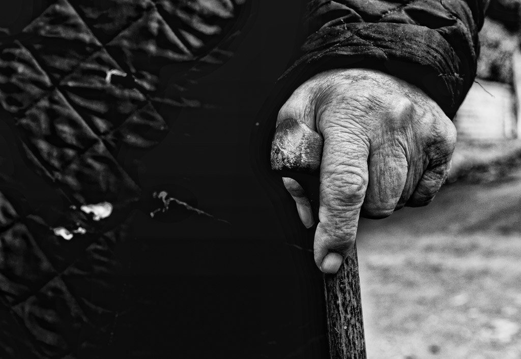 La pelle e il bastone rendono visibili tutte le fatiche del suo passato che inevitabilmente prima o poi mostreranno i loro segni.