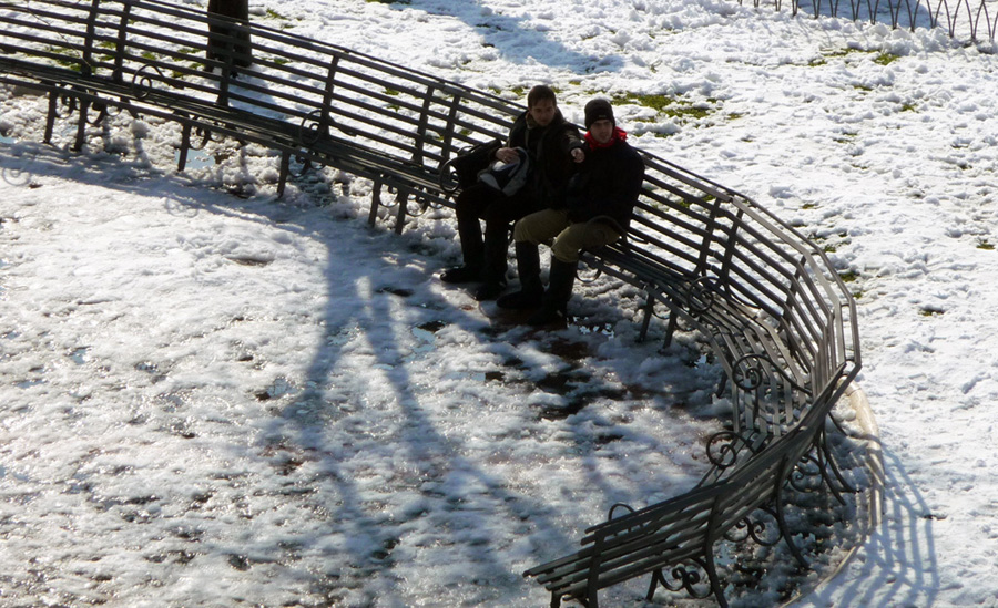 In quanto alla composizione (la foto è già tagliata rispetto all’originale), avevo provato a tenere i soggetti più laterali, ma in quel caso mi sembrava troppo centrale la panchina, che, col suo grafismo, volevo tenere come elemento principale della foto.