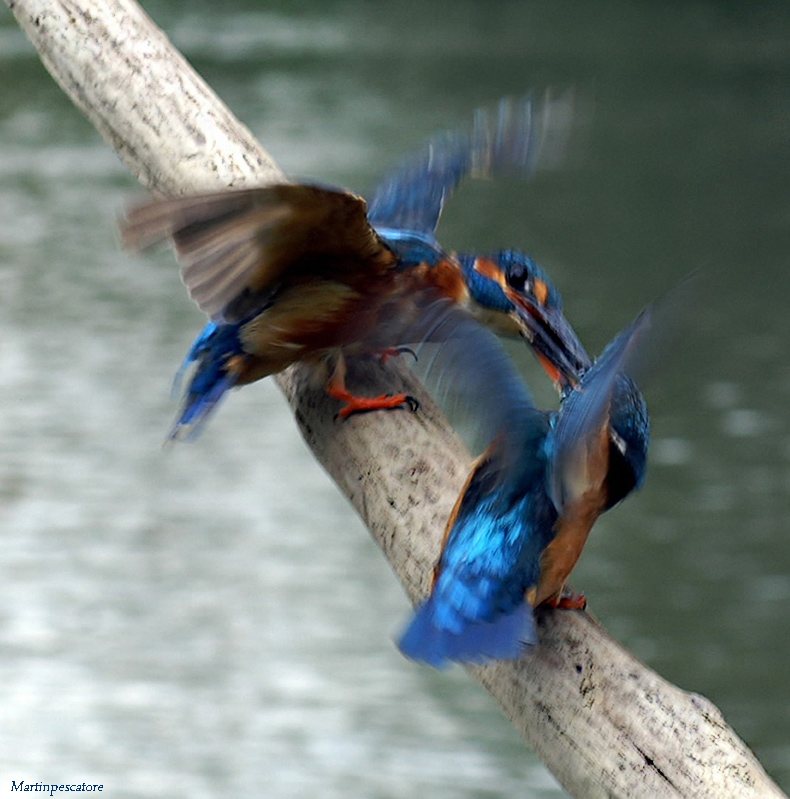 Personalmente mi piace come tipo di scatto, i due martin pescatori mossi danno la sensazione di lotta, però il tronco dovrebbe essere fermo e non mosso, così da avere la sensazione che sono loro che si muovevano e non tè con la macchina fotografica!!