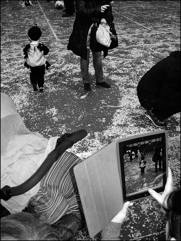 I corpi sono tagliati, l'attenzione e' sul bambino che si muove stranito in un mare di coriandoli, mi piace la mano della madre: quando abbozza un'attenzione verso una scena fuori dall'inquadratura.