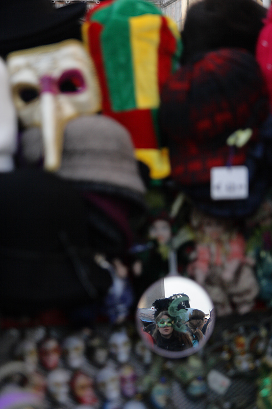 Maschera riflessa tra maschere sfocate in un bel gioco di diaframmature...