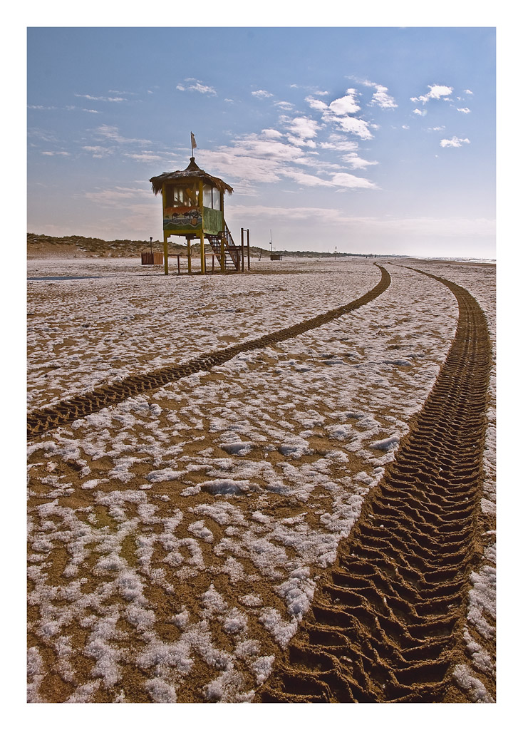 Il senso di pace della spiaggia deserta e costellata dai residui di una nevicata è accentuato dalla solitudine del capanno e dalla forte direzionalità delle impronte dei pneumatici che sanno di partenza.