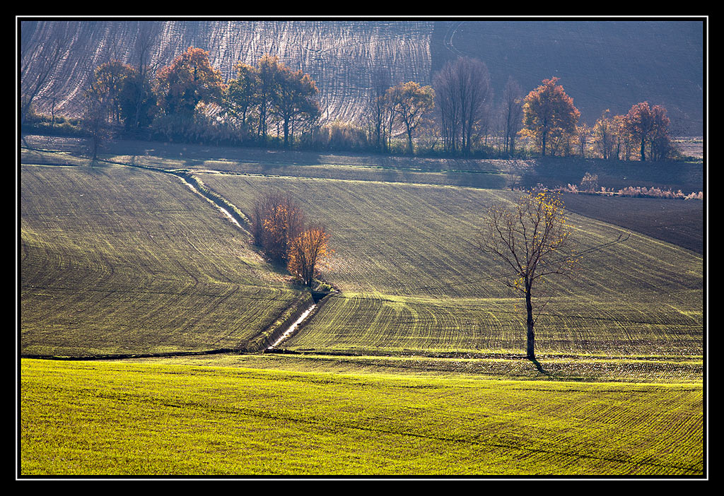 Per me un paesaggio veramente molto bello. Bello il colore della luce radente sul prato.