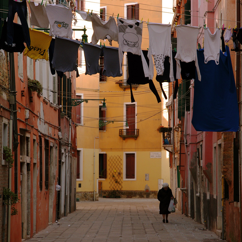 Non sono convinto che il formato quadrato fosse il migliore per questo scatto; avrei assecondato l'andamento verticale prevalente, collocando la figura della donna più in prossimità dell'angolo inferiore destro e dando maggior aria in alto dove gli elementi presenti soffrono un po', in particolare sulla sinistra. Per il resto una foto classica di questo scorcio tipico di molte nostre città e che però funziona sempre.