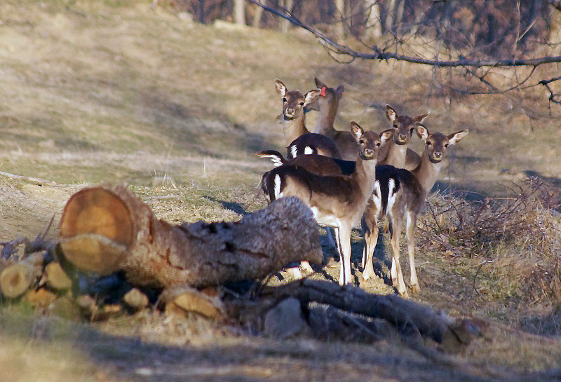 Incontro entusiasmante, bella foto. Che à quella sorta di farfallina rosa all'orecchio dell'ultimo esemplare, e la simile macchiolina rosa sull'altro orecchio? Non dirmi che hai regalato un paio di orecchini alla signora daino per convincerla a mettersi in posa con tutta la famiglia...