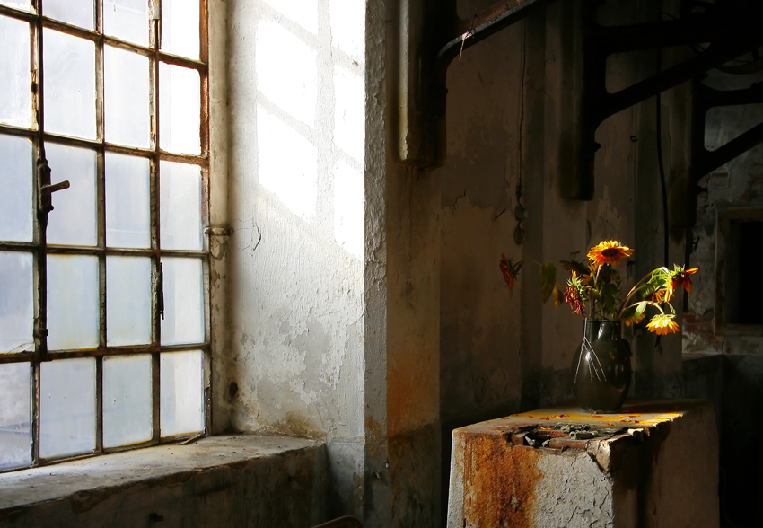 Molto bella ed equilibrata, ricca nelle luci e nelle ombre, altamente evocativa. Foto di simboli, che va "letta" con calma, per soffermarsi sui particolari, sulle luci della finestra, sulla delicatissima ombra contro la parete chiara, sulla fuga di elementi di sostegno sulla parete a perdersi nell'oscurità, sul muro, quasi un altare, su cui poggia il vaso, sui fiori, meta ultima dell'immagine. Un bel risultato.