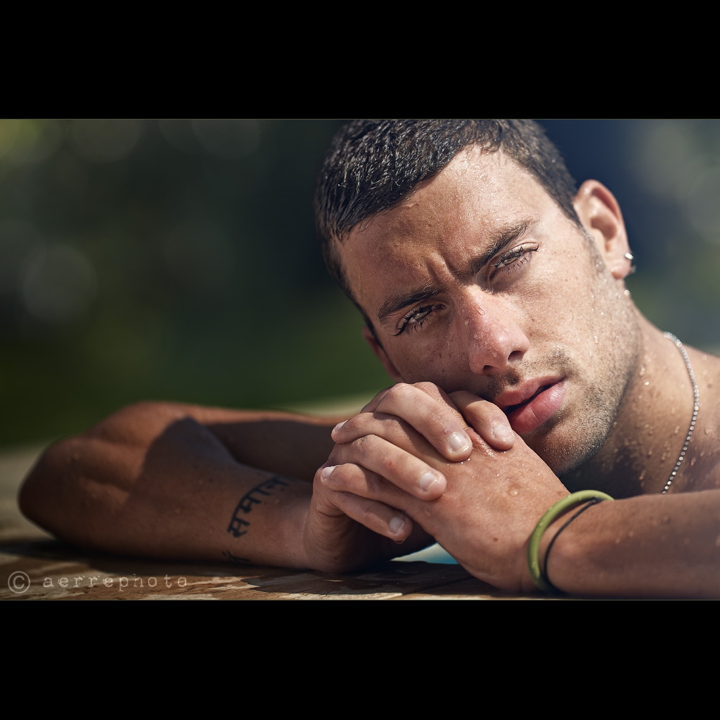 così è meglio resa l'atmosfera assolata che permea lo scatto. la posa è bellissima con le diagonali offerte da testa e collo da una parte e braccia dall'altra. sfrutti benissimo la forza del gesto delle mani dalle dita intrecciate a sottolineare la solidità del fisico allenato di Marco. ciliegina sulla torta la moltitudine di perle d'acqua illuminate dal sole sulla pelle di lui che, non bastasse la fissità dello sguardo con gli occhi appena strizzati, connotano la fotografia di una forte carica sensuale.