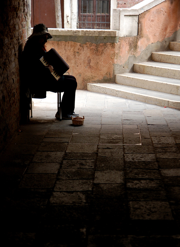 Mi piace come la luce colpisce l'artista rivelando solo la mano e la tastiera dello strumento, e lasciando invece tutto il resto in "sordina"...