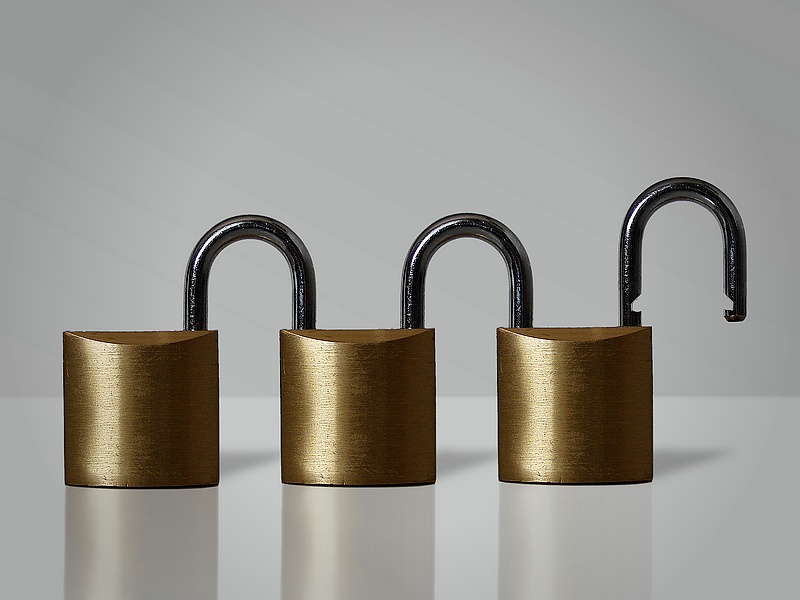 Il titolo dell'imagine è un gioco di parole fra tre e lucchetto. Infatti lo stesso lucchetto si vede tre volte. Ho tolto la marca stampigliata sul corpo per una maggiore pulizia, quindi potevo anche eliminare qualche graffio o spostarlo in un altro punto, ma non l'ho fatto di proposito.