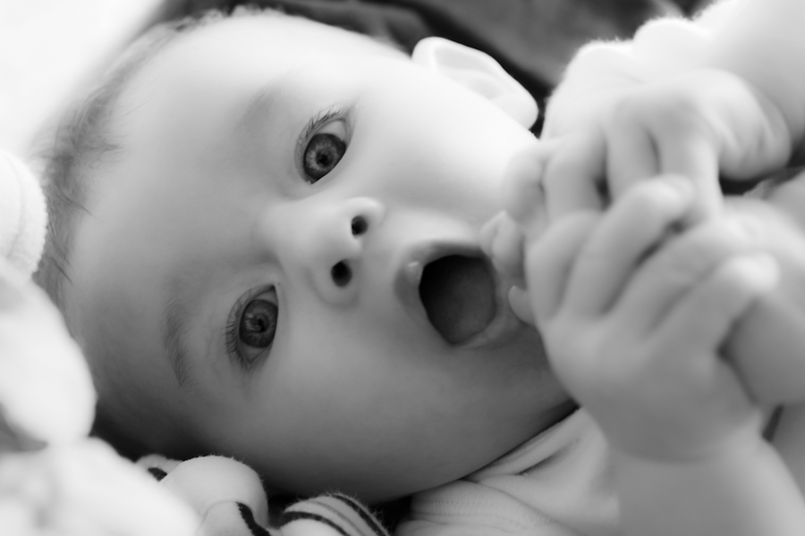 E allora benvenuto nel tunnel. Lo trovo un buon b/n ma un po' troppo plastificato nella resa della pelle (soprattutto il lato più illuminato e l'orecchio). Peccato la messa a fuoco scarsa sulle mani e sul piedino del titolo (che però quasi non si vede). Se il protagonista è tuo figlio intanto auguri: è bellissimo e potrai "sfruttarlo" come soggetto con grande soddisfazione.