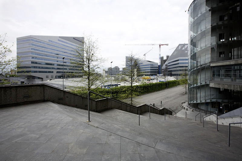 Incuriosisce e cattura l'osservatore, questo paesaggio urbano. Perché ampio e disabitato, in parte, e poi perché le linee prospettiche del primo piano ci accompagnano dentro la scena. Ma soprattutto perché presenta una serie di incongruenze prospettiche indotte dalle conformazioni architettoniche non "convenzionali". L'edificio sulla sinistra sembra mozzato, sembra tagliato da un margine superiore della foto messo al posto sbagliato. E anche l'edificio circolare sulla destra sembra sbagliato, data la forma dell'elicoidale che correndo esternamente inganna la prospettiva. Un bell'insieme di elementi, di linee oblique, di angoli e curve che in una luce piatta e ferma produce un buon risultato, per me.