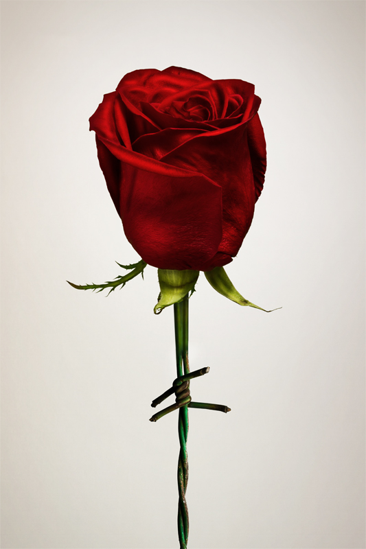 Oltre che ad un suggestivo accostamento del filo spinato al gambo della rosa, trovo la resa dei petali davvero eccezionale, colori e luci!
